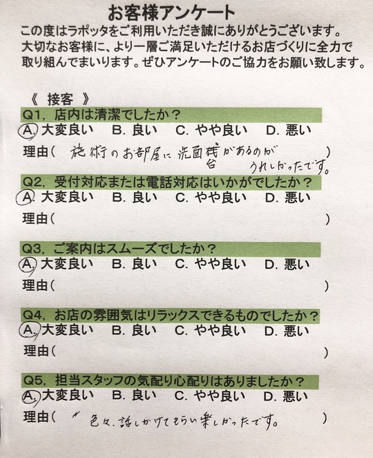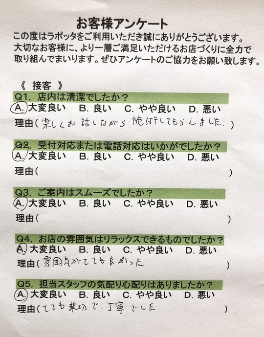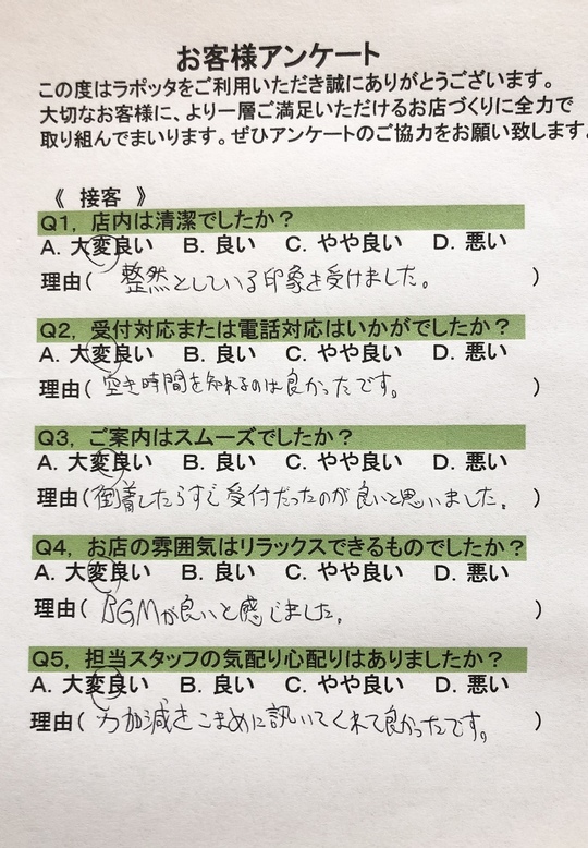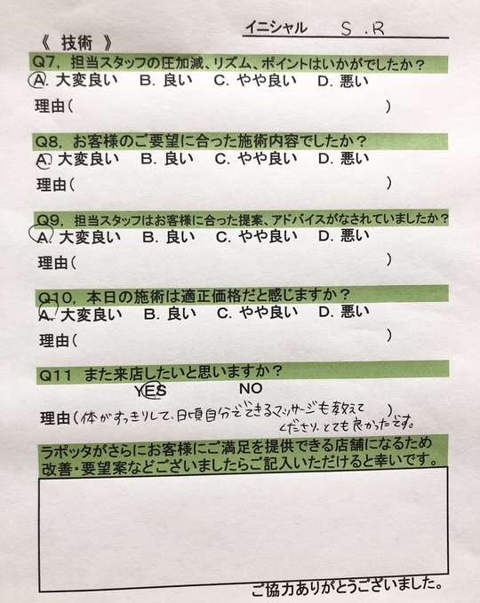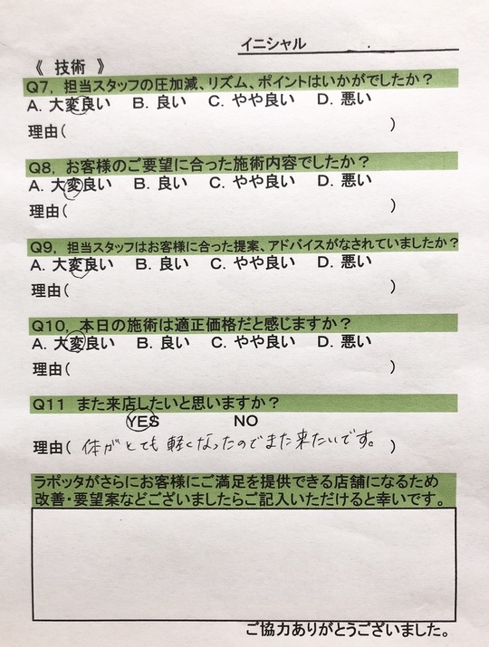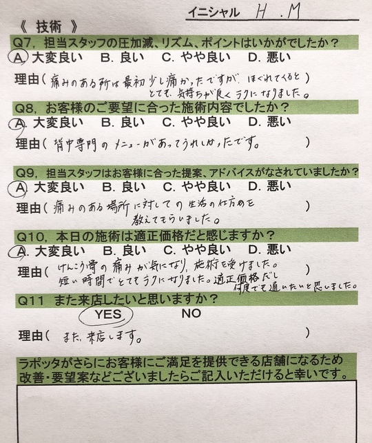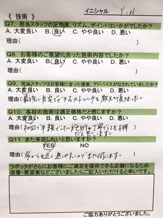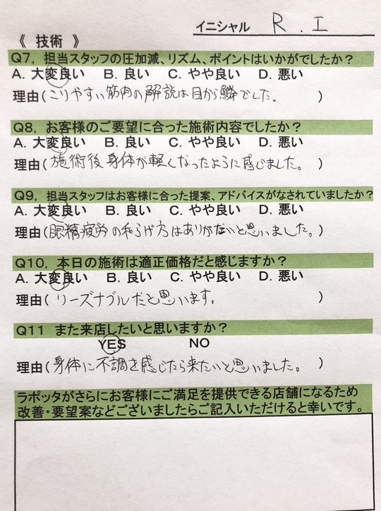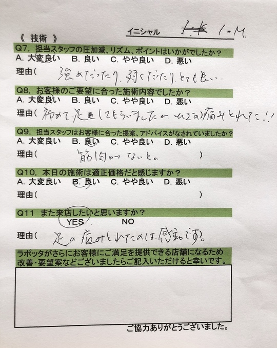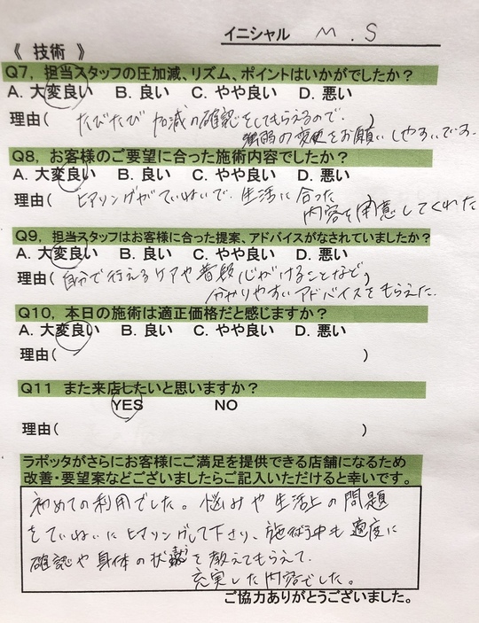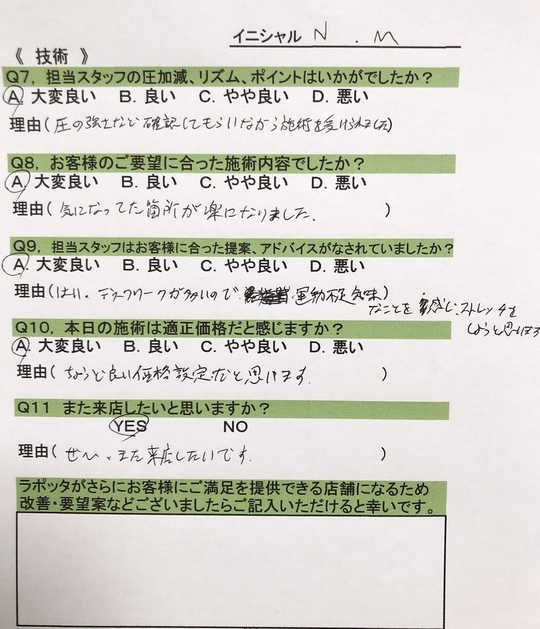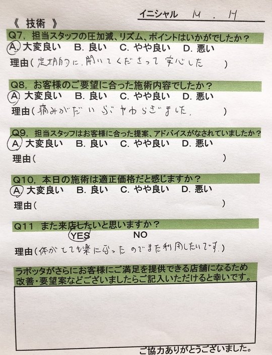 気になってた箇所が楽になり何よりでございます。圧が強めの施術になってしまったのですが、施術中もしかしたら少し痛かったかもしれません。。首に負担かからない程度に肩を回したり、ストレッチしたりなどしてみてくださいね。